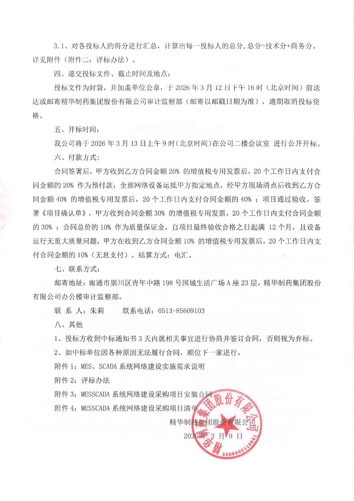 关于2026年精华制药MES、SCADA系统网络建设招标材料,详见附件:
